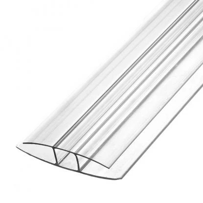 Профиль выполнен в виде Н-образной планки с пазами по длинным сторонам, в которые и вставляются края поликарбоната. В результате образуется плотное соединение, исключающее перемещение листов под собственным весом или внешними нагрузками. Изготовлен из того же материала, что и поликарбонат, поэтому места стыка практически не заметны. Высокая плотность примыкания обеспечивает отсутствие проникновения влаги, пыли и загрязнения.