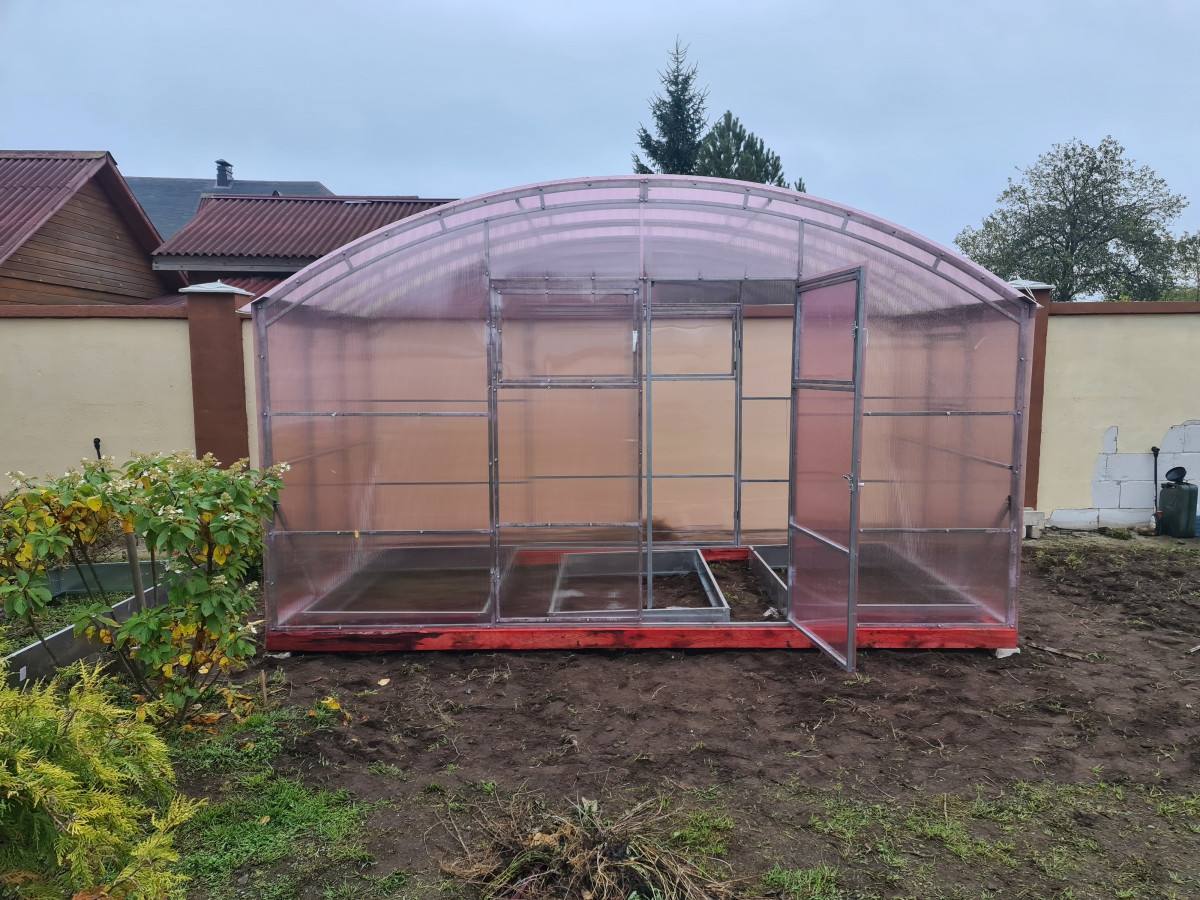 • широкая 4 м, ширина теплицы позволяет организовать 3 широкие полноценные грядки с комфортными проходами между ними;
